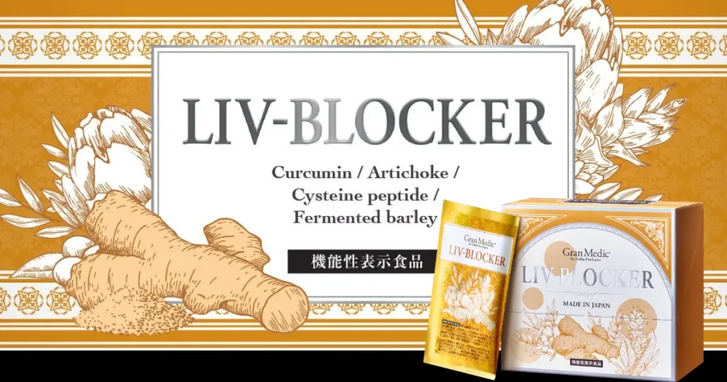 年齢や生活習慣に左右されないライフスタイルをアシストする機能性表示食品「リヴブロッカー」。メイン配合の特許素材※「高吸収クルクミン」は、ウコンの主要な有用成分である「クルクミン」の約27倍の吸収率を誇ります。肝臓の健康サポートをメインに、忙しい方のデイリーインナーケアをご提供します。