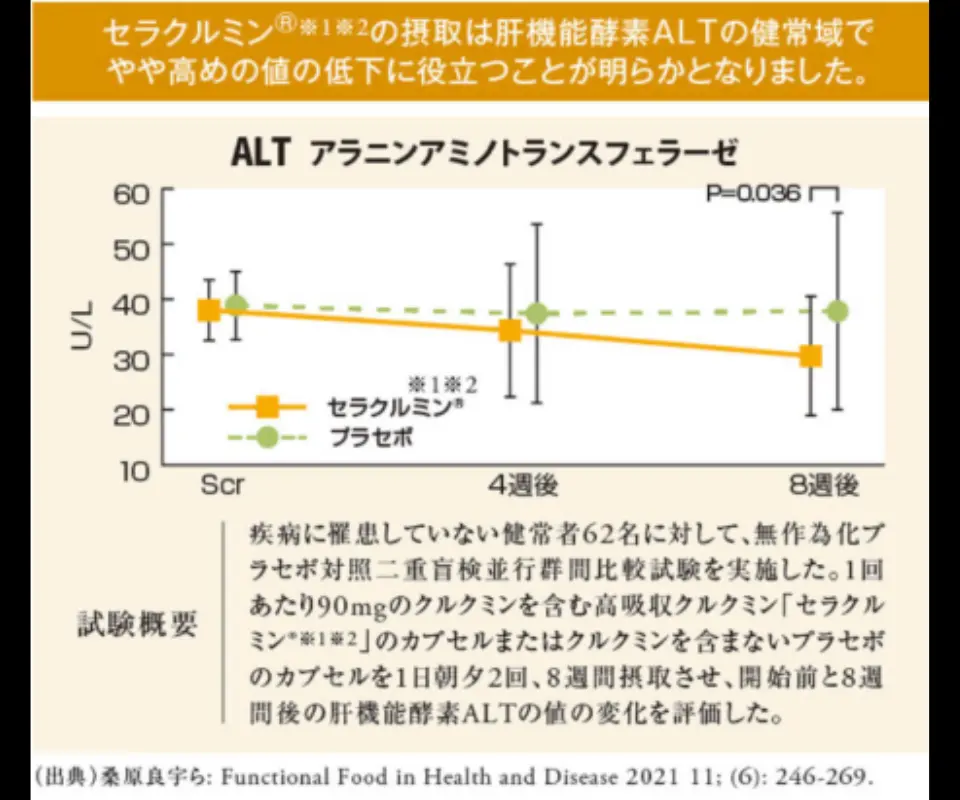 結果、セラクルミン®※1※2を摂取していた群では、摂取の8週間後におけるALTの値がプラセボ群を比較して、有意な低下を示しました。※3