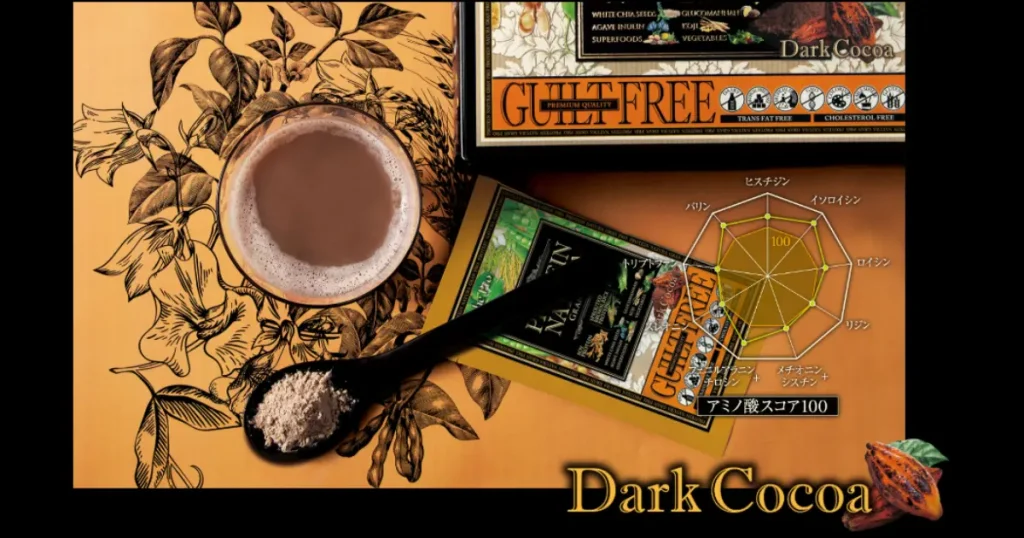 大豆タンパク(アメリカ合衆国製造)、有機アガベシュガー、有機アガベイヌリン、ココアパウダー、発芽玄米タンパク、黒糖、ドロマイト、ホワイトチアシード、エンドウ豆タンパク、グルコマンナン、コーヒー、穀物麹抽出濃縮物、カルシウム(天然水由来)、鉄含有酵母、ケール、モリンガ、ブロッコリー、ビタミンD含有酵母、甘藷、マカ、ユーグレナ・グラシリス発酵物、アマランサス、キヌア、クコの実、チアシード、バオバブ、ほうれん草、小松菜、麻の実、苦瓜、明日葉、桑の葉(一部に大豆を含む)