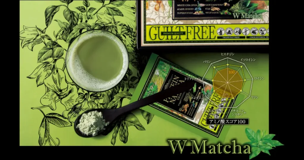 大豆タンパク(アメリカ合衆国製造)、有機アガベシュガー、有機アガベイヌリン、抹茶、発芽玄米タンパク、ドロマイト、ホワイトチアシード、エンドウ豆タンパク、グルコマンナン、穀物麹抽出濃縮物、ほうじ茶、カルシウム(天然水由来)、鉄含有酵母、ケール、モリンガ、ブロッコリー、ビタミンD含有酵母、甘藷、マカ、ユーグレナ・グラシリス発酵物、アマランサス、キヌア、クコの実、チアシード、バオバブ、ほうれん草、小松菜、麻の実、苦瓜、明日葉、桑の葉(一部に大豆を含む)