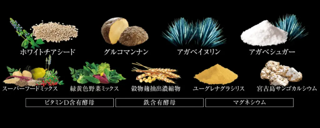 大豆タンパク(アメリカ合衆国製造)、有機アガベシュガー、有機アガベイヌリン、きな粉、黒糖、発芽玄米タンパク、オーツ麦粉末、ドロマイト、黒すりごま、ホワイトチアシード、エンドウ豆タンパク、グルコマンナン、穀物麹抽出組成物、カルシウム(天然水由来)、食塩、みりん粕パウダー、鉄含有酵母、ケール、モリンガ、ブロッコリー、ビタミンD含有酵母、甘藷、マカ、ユーグレナ・グラシリス発酵物、アマランサス、キヌア、クコの実、チアシード、バオバブ、ほうれん草、小松菜、麻の実、苦瓜、明日葉、桑の葉(一部に大豆、ごまを含む)